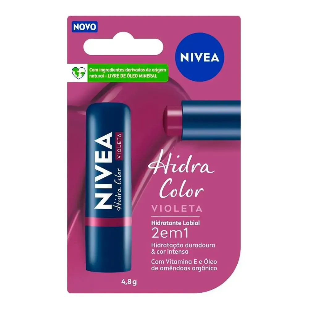 NIVEA Hidra Color Violeta combina cor intensa com o cuidado confiável de NIVEA. Com fórmula livre de óleo mineral, NIVEA Hidra é enriquecido com manteiga de karité, óleo de amêndoas orgânico, vitamina E. Com acabamento violeta intenso, tem aroma floral suave especialmente desenvolvida para o uso diário.