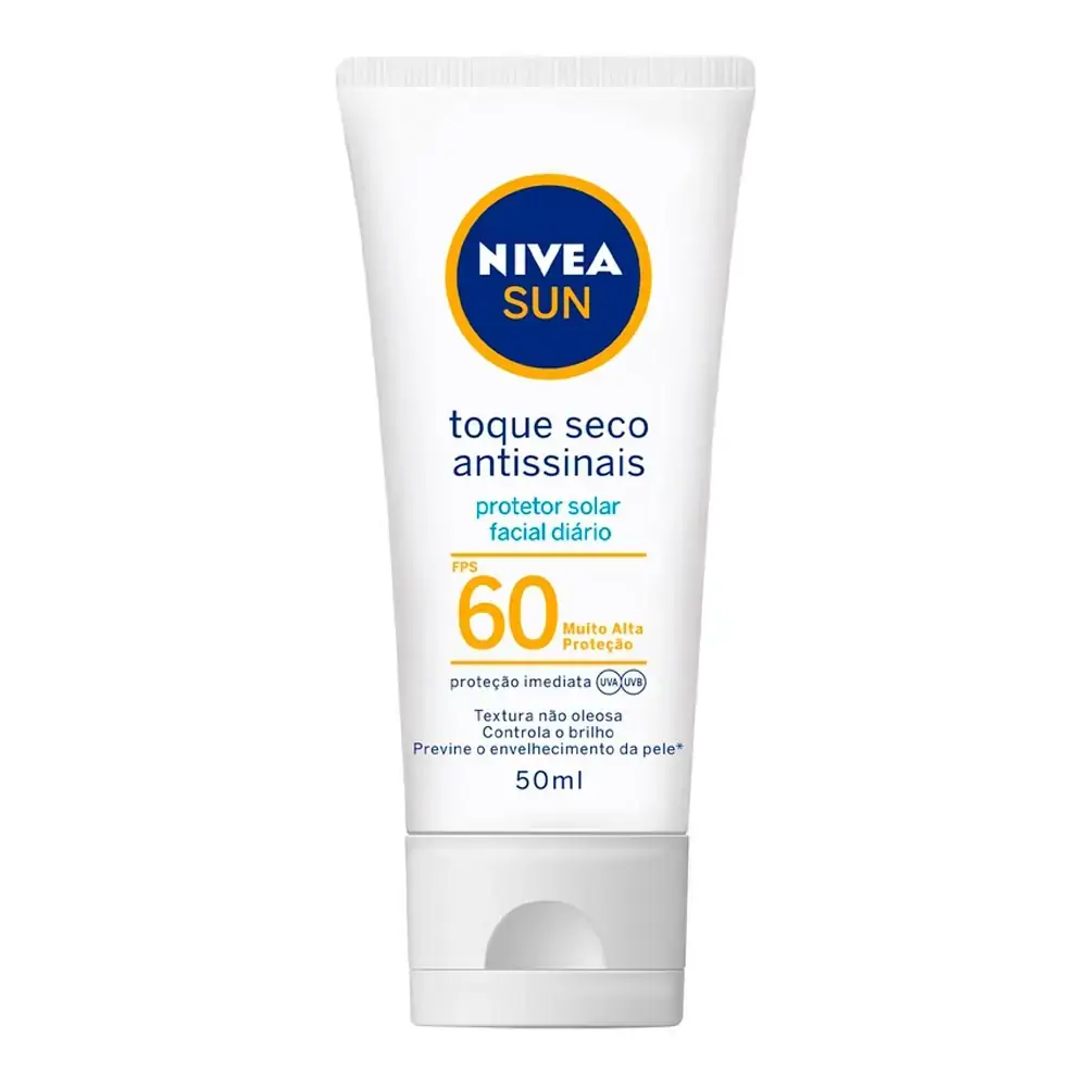 NIVEA Sun Facial Toque Seco Antissinais é um protetor solar facial para uso diário. Com exclusiva fórmula de textura leve, rápida absorção e toque seco, controla o brilho e deixa sua pele macia e radiante. Além de oferecer alta proteção imediata UVA/UVB contra os efeitos do sol, previne o envelhecimento precoce da pele causado pela exposição solar/radiação. Perfeito para usar até mesmo antes da maquiagem. - Alta proteção contra raios UVA/UVB - Oil free - Textura ultra leve - Toque seco - Reduz e controla o brilho - Resistente à água - Previne o envelhecimento da pele causado pela exposição solar
